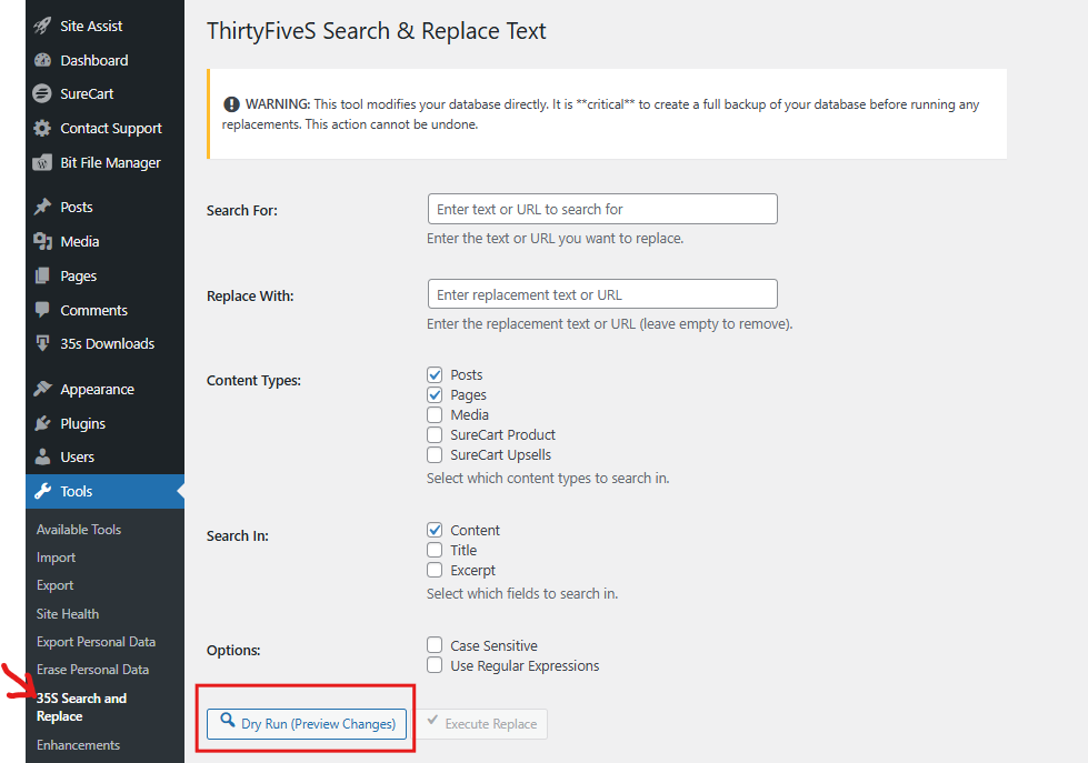 • Navigate to the Tools > 35S Search and Replace menu item in your WordPress admin dashboard.
